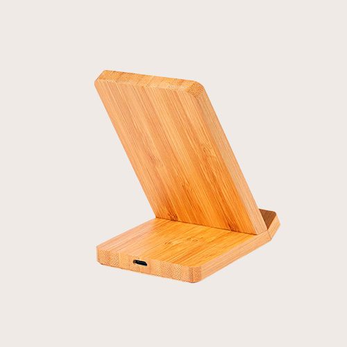Cargador inalámbrico con función soporte para smartphone. Fabricado en bambú, con superficie en elegante color negro. Luz led interior y recubrimiento exterior especialmente diseñado para marcaje en láser, iluminando así el logotipo. Con función carga de 15W y compatible con dispositivos equipados con tecnología Qi. Amplia superficie de marcaje y presentado en atractiva caja de diseño kraft.