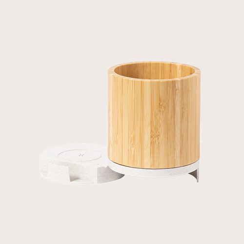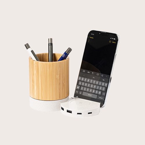 Lapicero multifunción 4 en 1 fabricado en bambú y fibra de trigo. Con funciones lapicero, soporte para smartphones, cargador inalámbrico 5W, puerto USB (2 x USB 2.0 y 1 x tipo C). Compatible con smartphones con tecnología de carga inalámbrica Qi. Incluye cable tipo C en color blanco de 1 metro de largo.