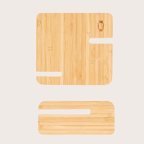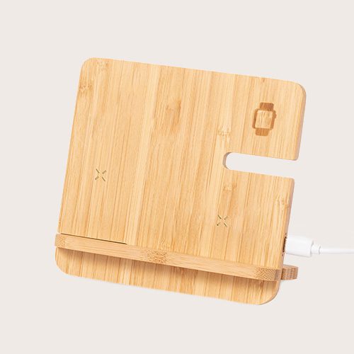 Completo multicargador inalámbrico 15W con soporte para gadgets, fabricado en bambú. Diseñado para la carga simultánea del smartphone, auriculares y smartwatch: una estación de carga todo en uno, versátil y con diferentes soportes.