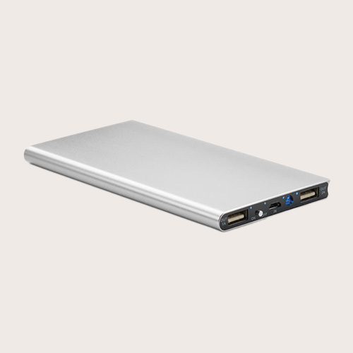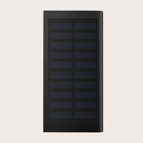 Power bank de 8000 mAh en aluminio reciclado y panel solar. Capacidad para smartphone, corriente de salida DC5V/1A y DC5V/2A. Incluye luz indicadora y cable USB con conector micro usb.