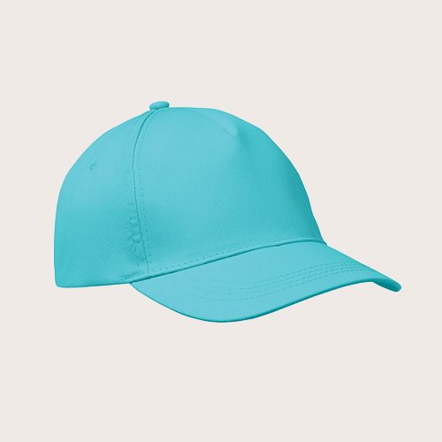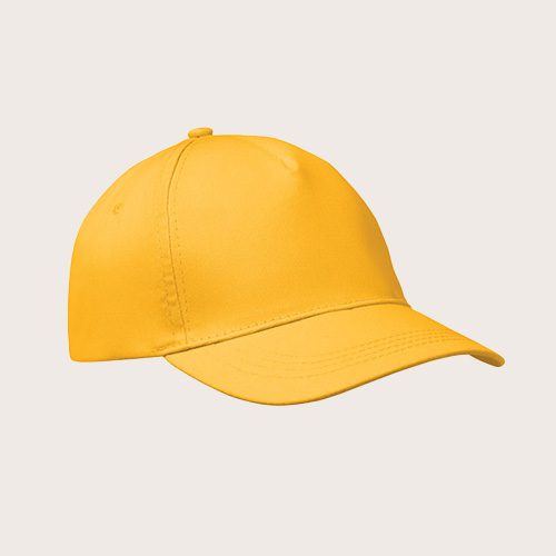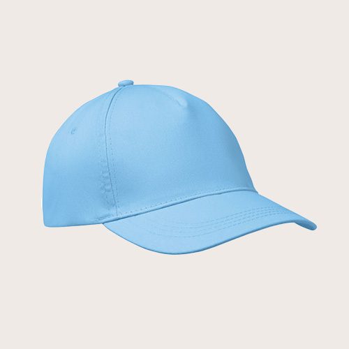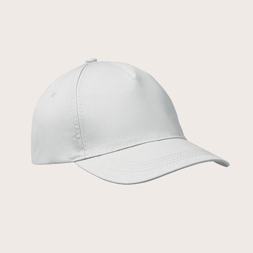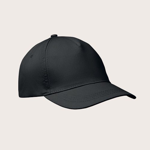 Gorra de béisbol de 5 paneles en sarga de algodón de 160 g/m² con cierre de velcro ajustable.