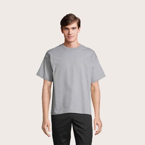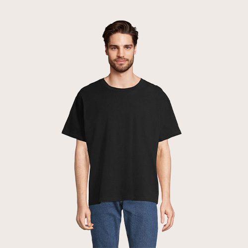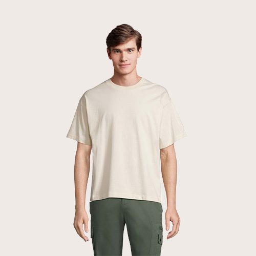 Camiseta de hombre, 50% algodón reciclado – 50% algodón, Cuello redondo con borde acanalado, Tubular, Corte oversize, De hombro caído, Cinta de protección en el cuello y hombros.