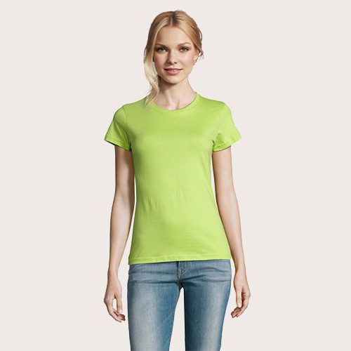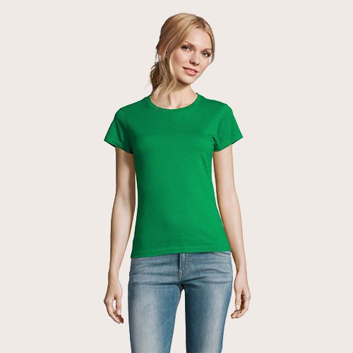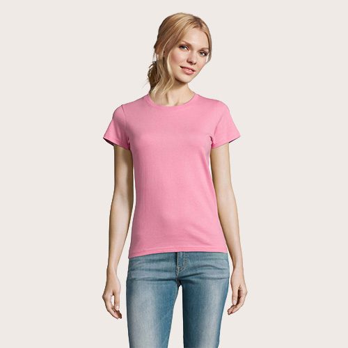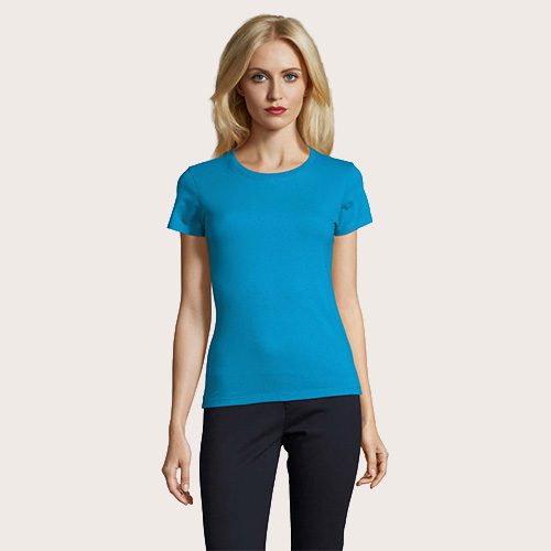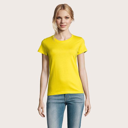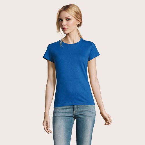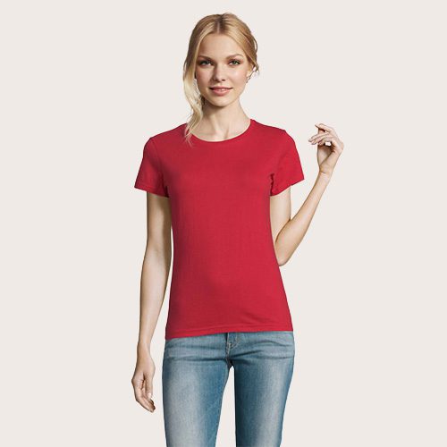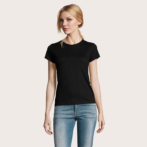 Camiseta de mujer de cuello redondo, confeccionada en 100% algodón Ringspun semi-peinado (jersey 190 g). Incorpora cinta de refuerzo en el cuello y cuello acanalado para mayor comodidad y durabilidad. Diseño de manga corta, con corte y costura, que aporta un ajuste femenino y favorecedor.