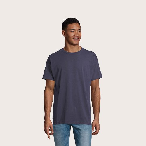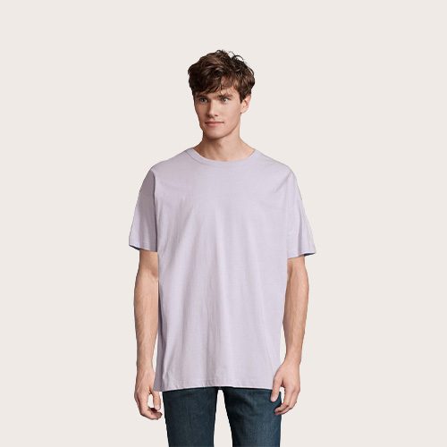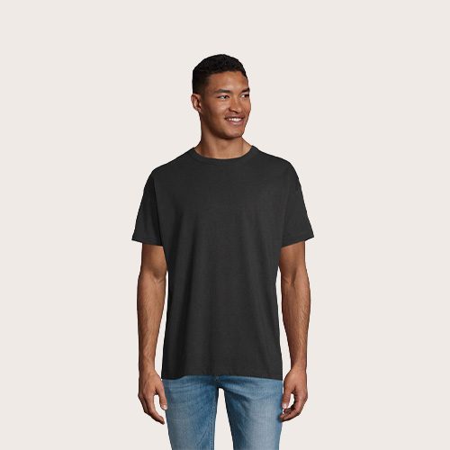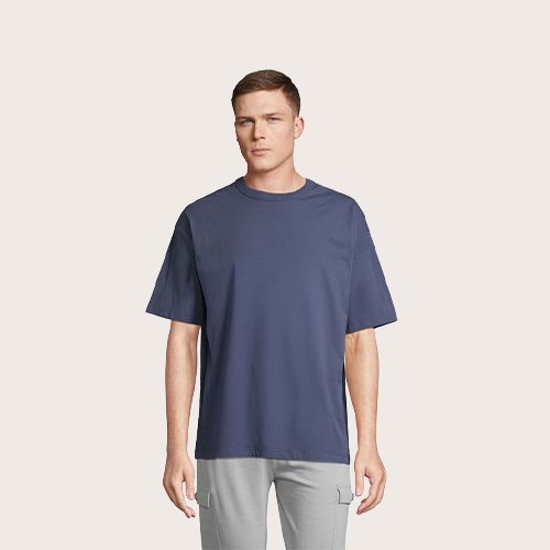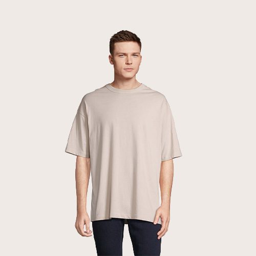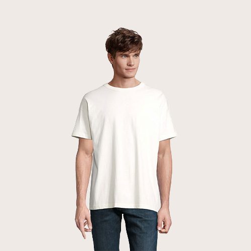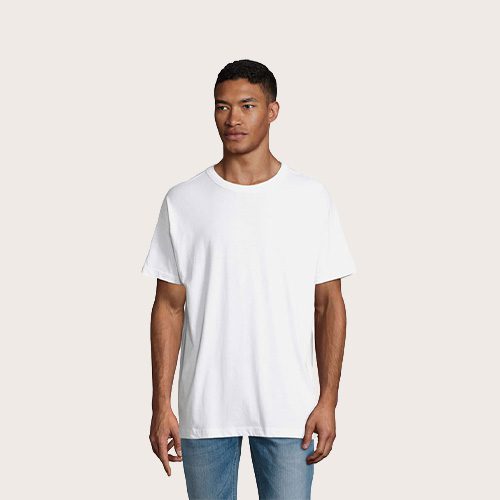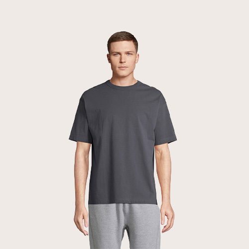 Camiseta oversize para hombre, 100% algodón orgánico peinado – en jersey de conversión 180, cuello redondo, corte y costura, mangas caídas.