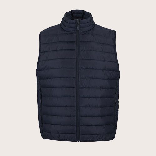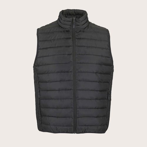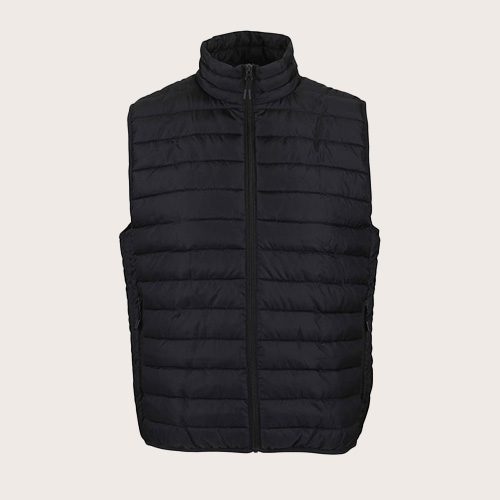 Chaleco ligero de hombre. Tejido exterior y forro: 100% poliéster. Acolchado: plumón 100% poliéster. Cierre frontal y bolsillos laterales con cremallera de nailon a tono. Deslizadores metálicos a tono con tiradores de cremallera negros de fantasía. Cuello alto con ribete elástico a tono en las sisas y el dobladillo. Se suministra con bolsa de almacenamiento.