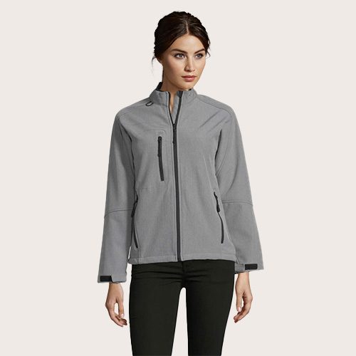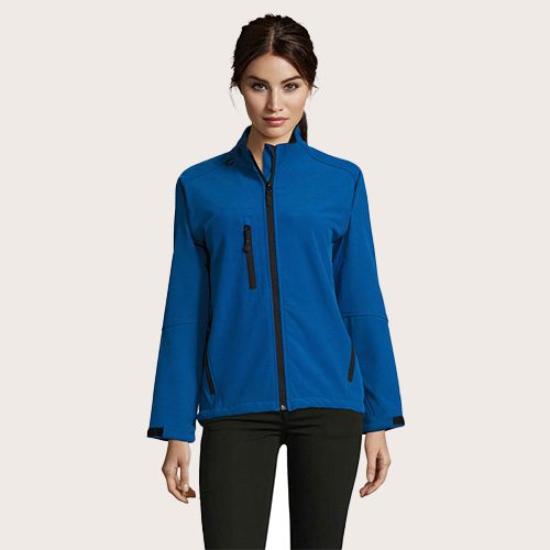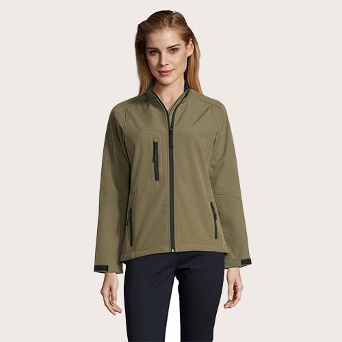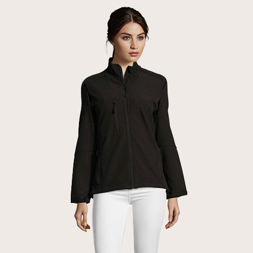 Chaqueta Softshell Mujer 340 g/m². Softshell 340, 3 capas, 94% poliéster – 6% elastano, 8000mm membrana impermeable y transpirable, 2 cremalleras en bolsillos laterales, 1 bolsillo en el pecho, cordón ajustable en la cintura, puño ajustable con velcro, cremallera SBS.