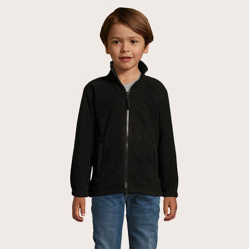 Chaqueta Polar Niño 300 g/m². Complemento de la gama de lana polar, excelente relación calidad/precio, destinado a cualquier tipo de mercado. 100% poliéster alta densidad, talle corto, anti peeling, tapacosturas reforzado en el cuello, cuello alto forrado, 2 bolsillos de cremallera en solapa, puños elásticos, media luna en la espalda, cordón de ajuste elástico en la base.