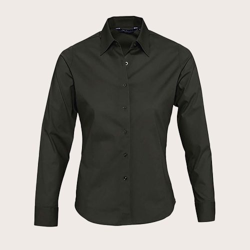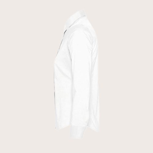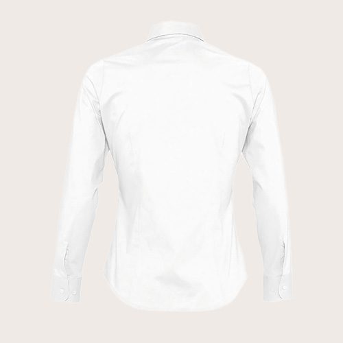 Camisa mujer manga larga, 97% algodón – 3% elastano, corte ceñido, mangas largas, cuello con un solo botón, puños con 2 botones y abertura con tapeta en punta, tapeta de 7 botones tono sobre tono, pinzas en la parte delantera y trasera.