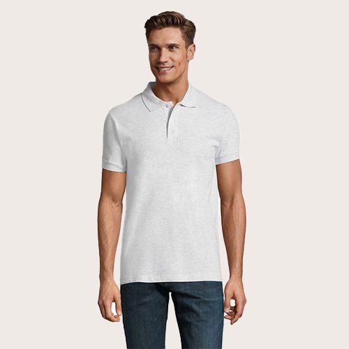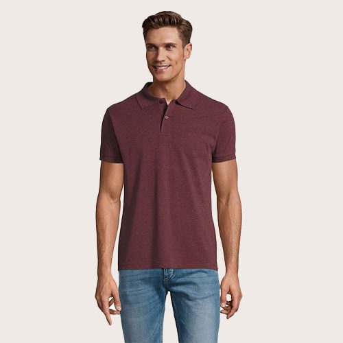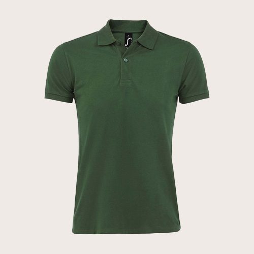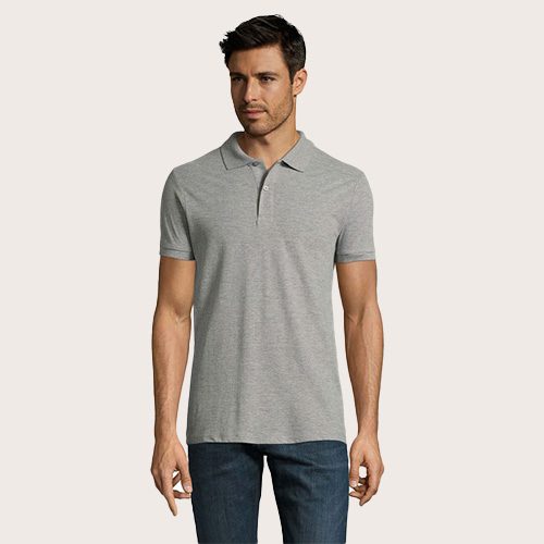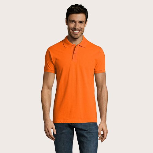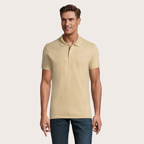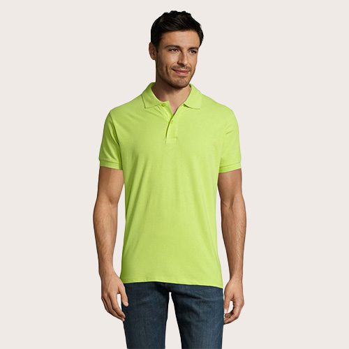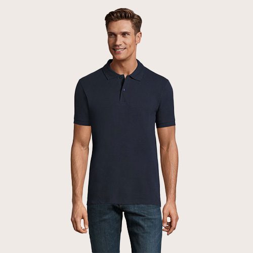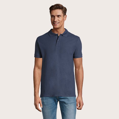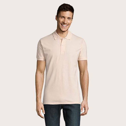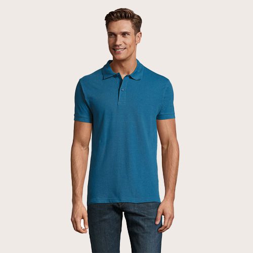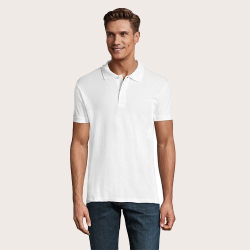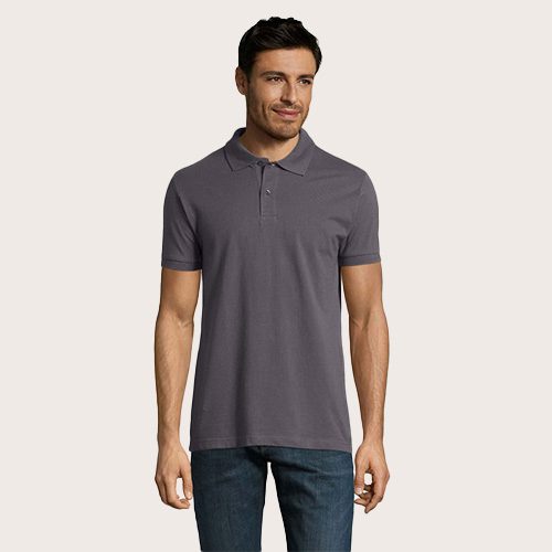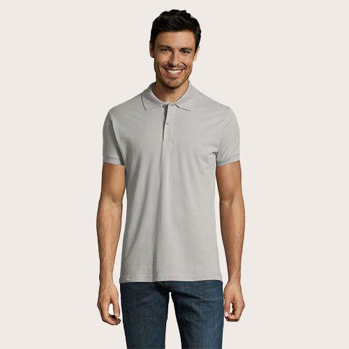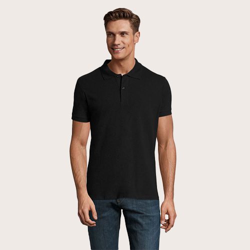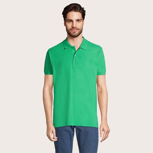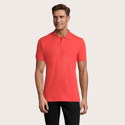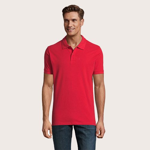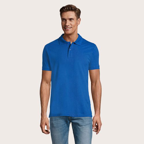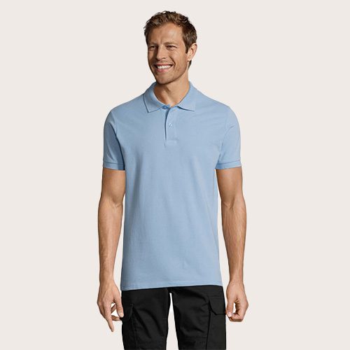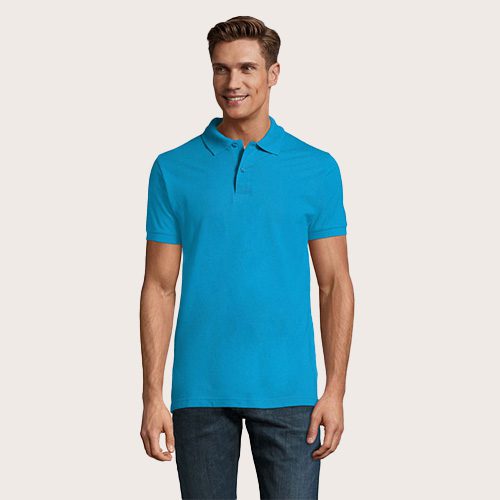 Polo de hombre 100% algodón peinado Ringspun. Piqué 180, cuello y puños de canalé 1 x 1, cinta de refuerzo en el cuello, mangas cortas, 2 botones perlados en plaqueta del mismo color, cortado y cosido, botón de repuesto en la costura interior.
