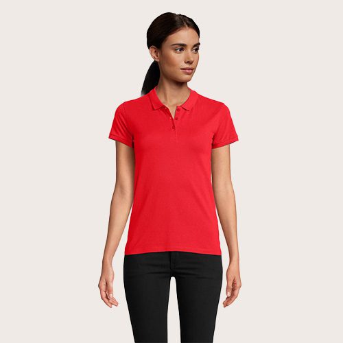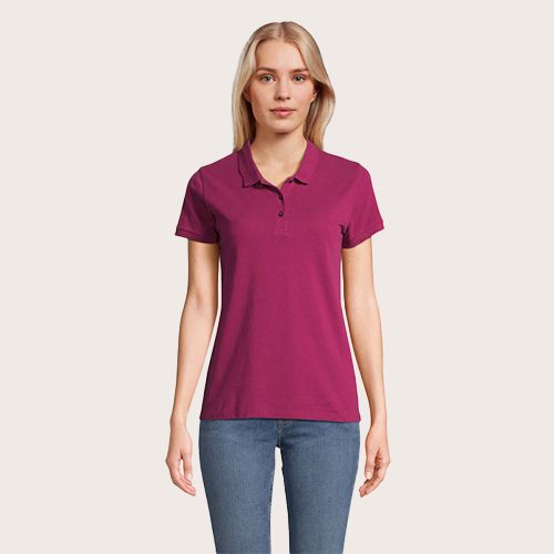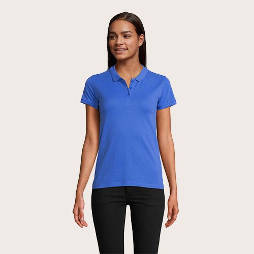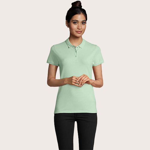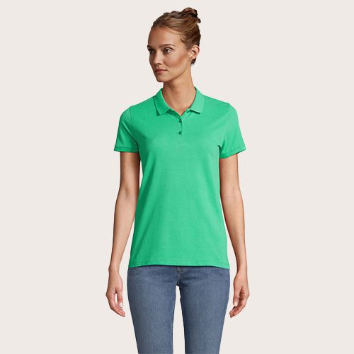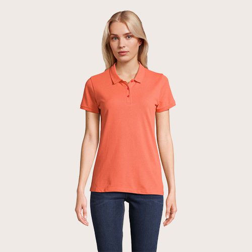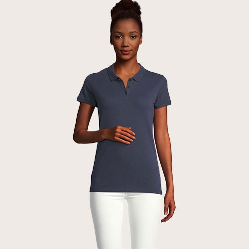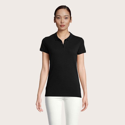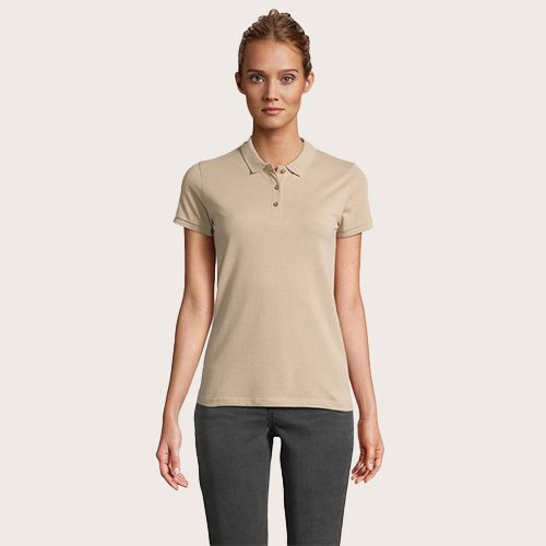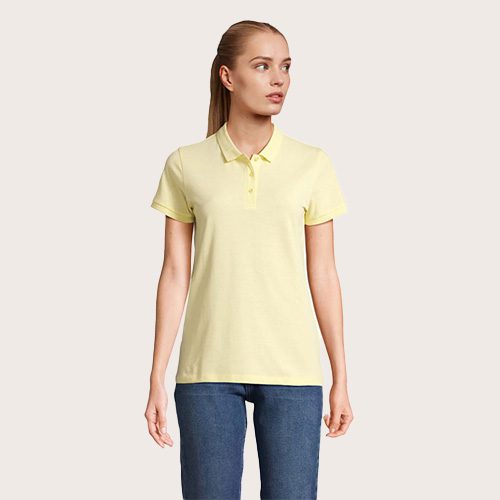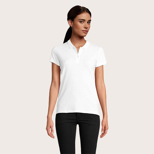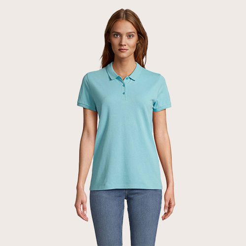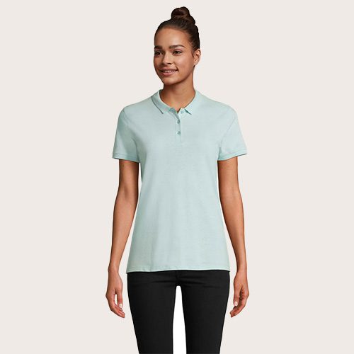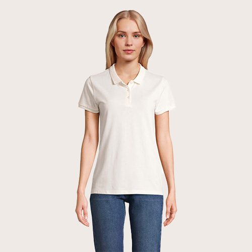 Polo de mujer 100% algodón orgánico piqué 170, cuello acanalado, forro en el cuello, tapa de botones reforzada, mangas cortas, tapa de botones de 3 tonos, bajo recto, cortado y cosido, botón de repuesto cosido en la costura lateral interna.