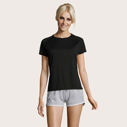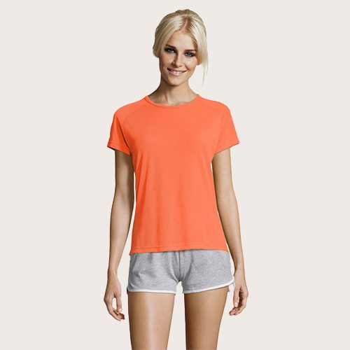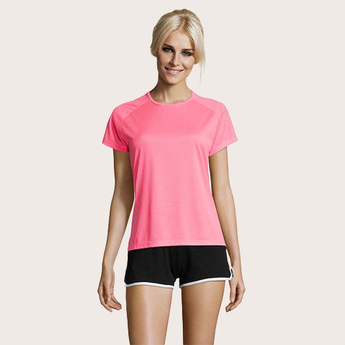 Camiseta Mujer 140 g/m². Su materia transpirable, su corte con mangas raglán y sus costuras planas hacen que sea el producto ideal para practicar deporte. Amplio abanico de tallas y colores, también incluye tonos fluorescentes, 100% poliéster transpirable, ribeteado en el cuello, mangas raglán, espalda más larga. Impresión en Sublimación solo disponible sobre el artículo de color blanco.