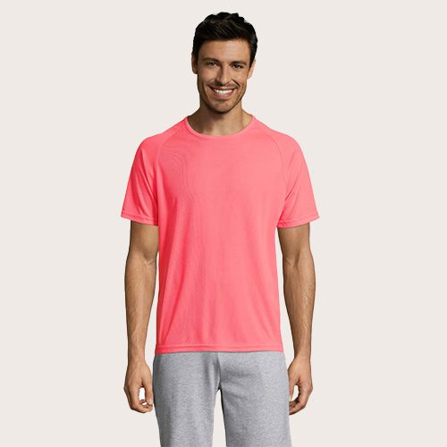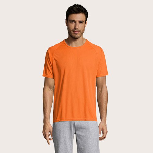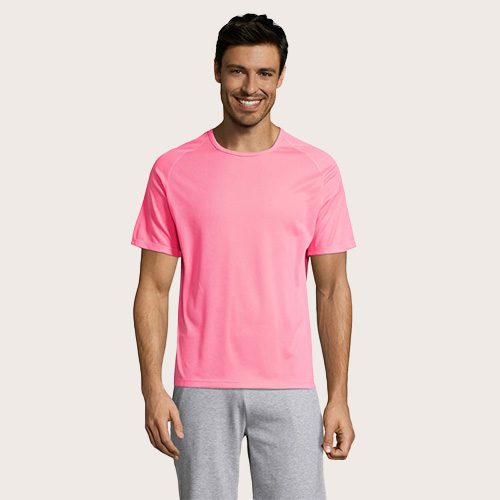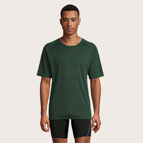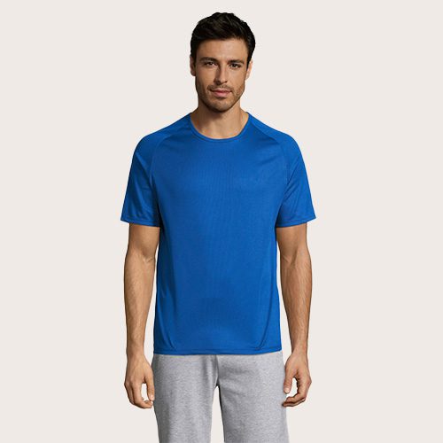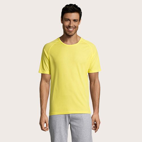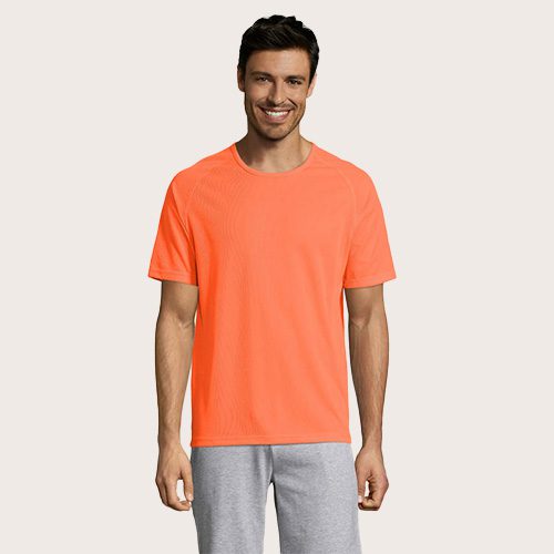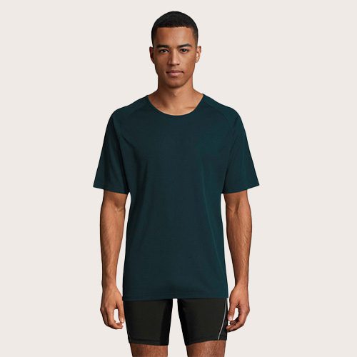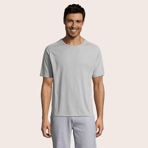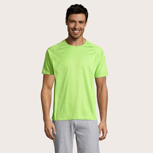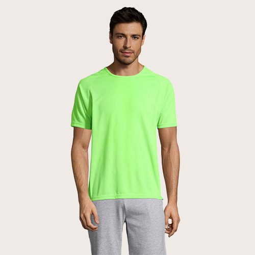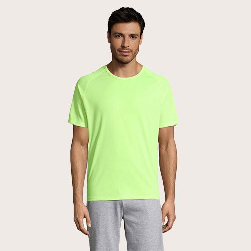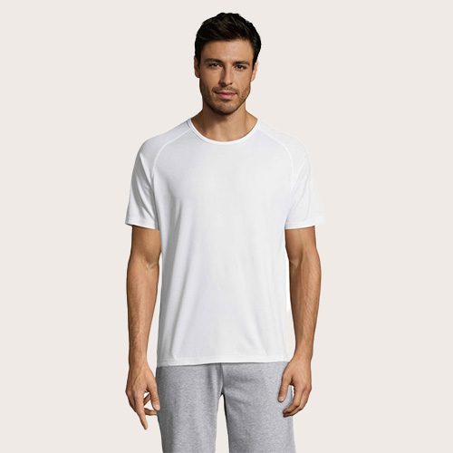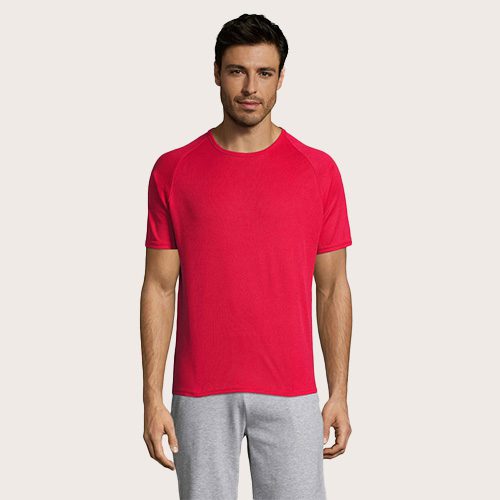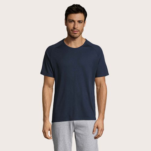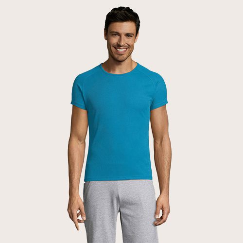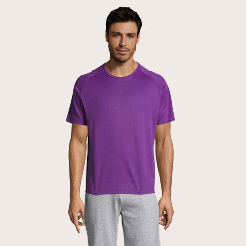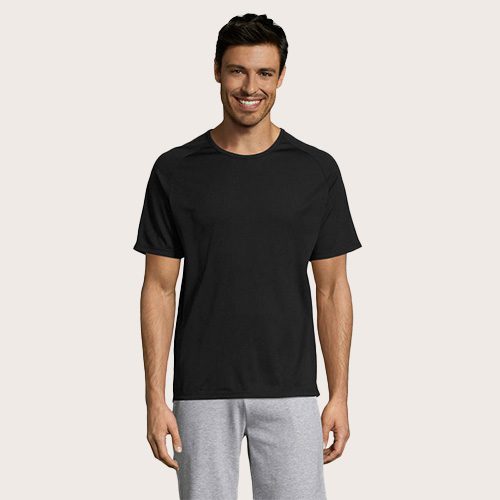Camiseta de manga raglán para hombre, 100% poliéster transpirable, malla de poliéster 140, unión en el cuello, mangas raglán, longitud más larga.