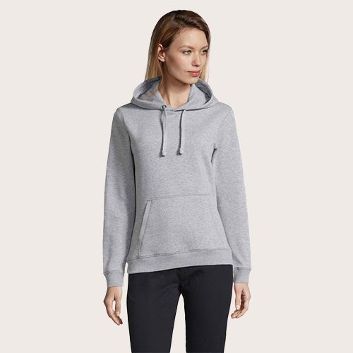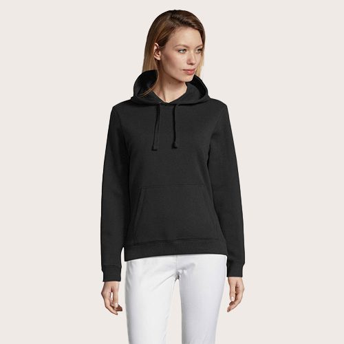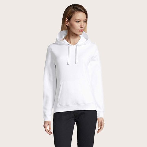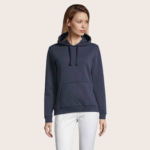 Sudadera con capucha de mujer 280 g. Bolsillo canguro. Cortado y cosido. Capucha forrada y dotada de cordón de ajuste. Acabado de canalé 2×2 en los puños y en el bajo. Media luna en el interior del cuello. Tapacosturas en el interior del cuello.