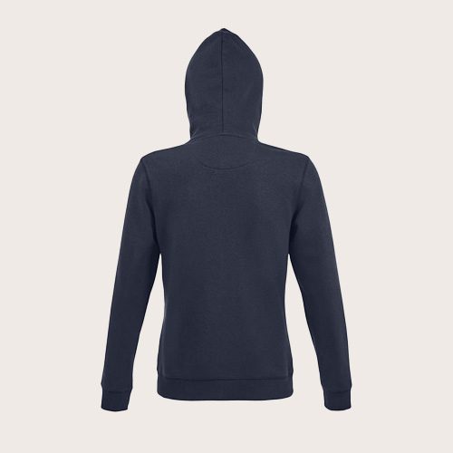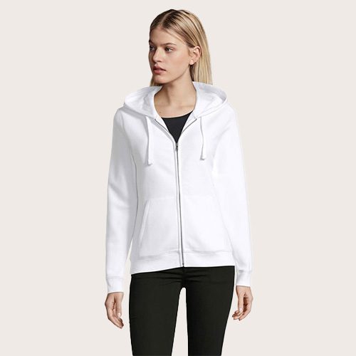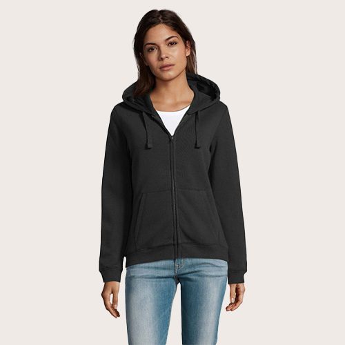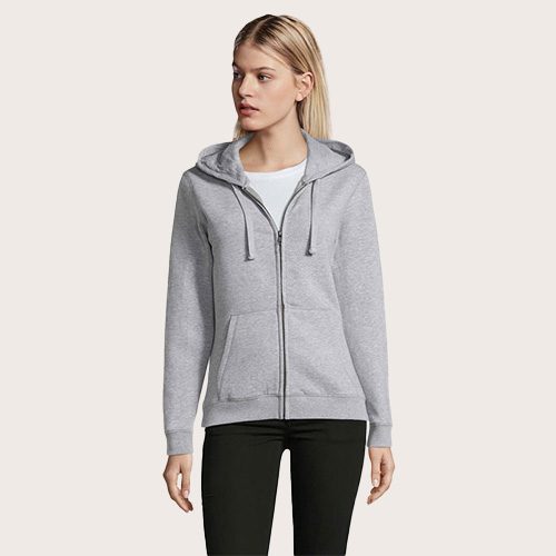 Sudadera con capucha y cremallera para mujer, 80% algodón ringspun – 20% poliéster, interior perchado, exterior: 100% algodón FLEECE 280 LSF (Low Shrinkage Fabric – tejido de bajo encogimiento), mangas montadas, 2 bolsillos canguro delanteros, cortado y cosido, capucha con cordón de ajuste tono sobre tono, puños y bajo con acabado de canalé 2×2, media luna en interior del cuello, tapacosturas en interior del cuello, cremallera