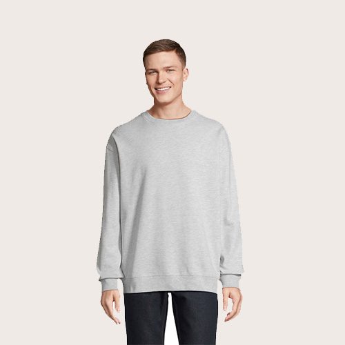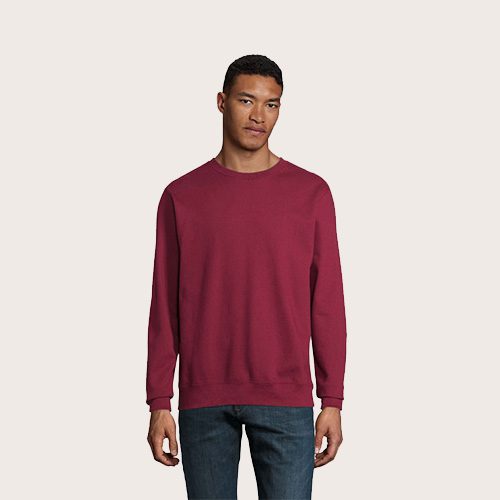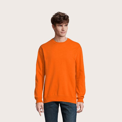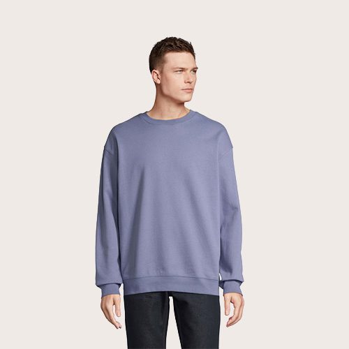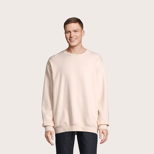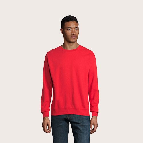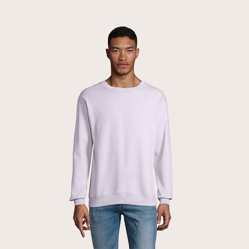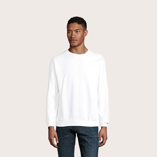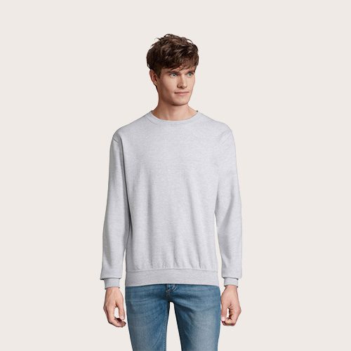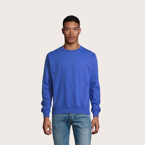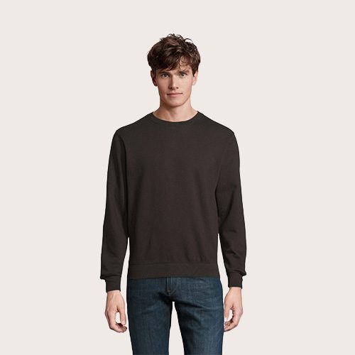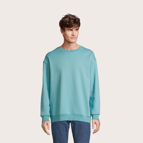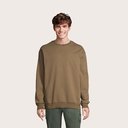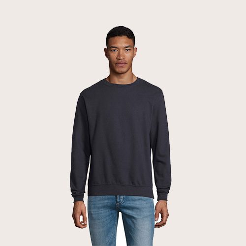 Sudadera unisex de cuello redondo, 80% algodón – 20% poliéster reciclado certificado GRS. Forro polar cepillado 280 cuello redondo, puños, cuello y dobladillo de canalé 2×2. Cinta en el cuello, mangas ajustadas.